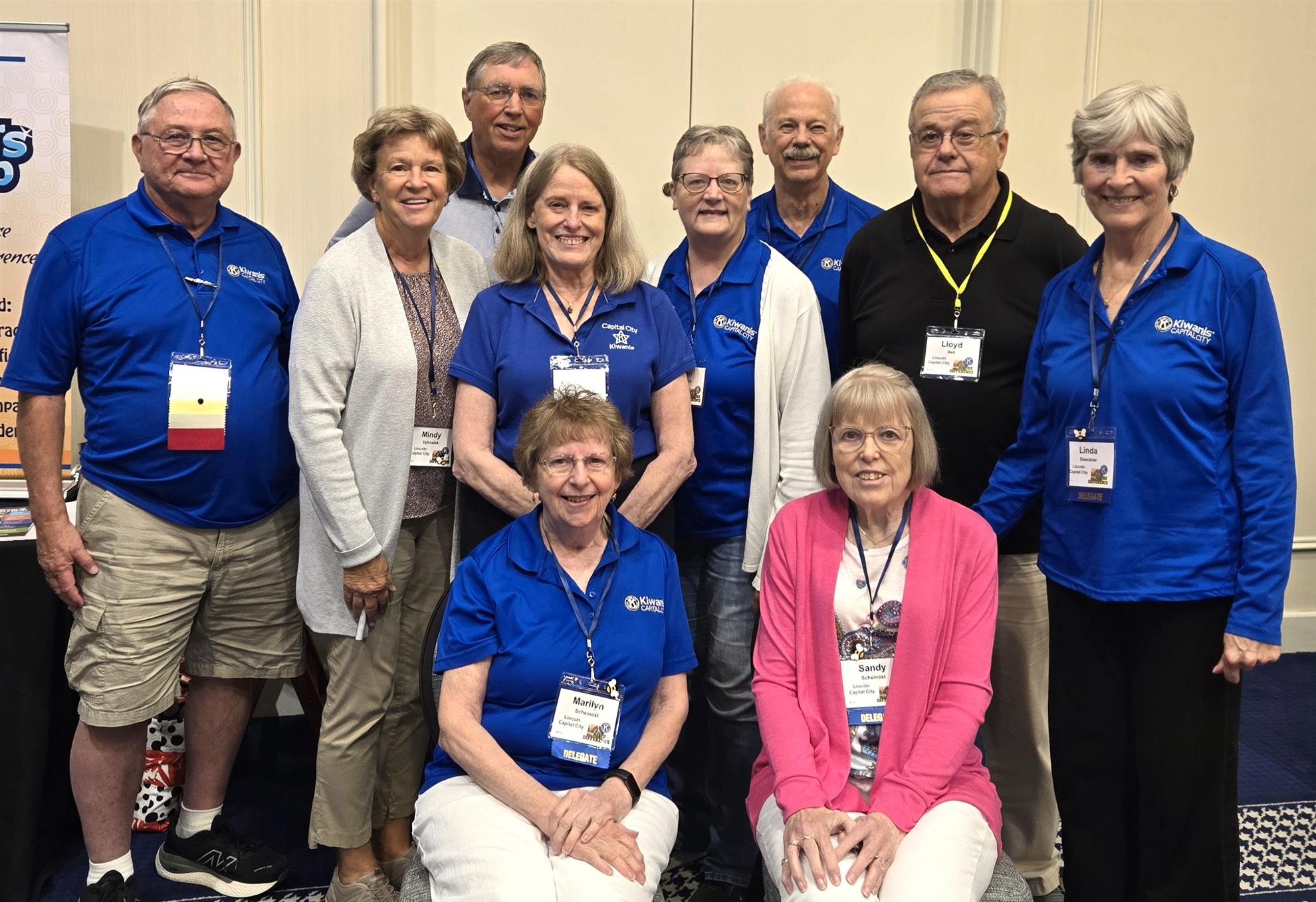 "BEE" the Difference! was Governor John Boltz's theme this past year. He handed out "bee" pins at the Nebraska-Iowa District Kiwanis Convention held at the Graduate Hotel in Lincoln, August 1 & 2. Nebraska was well represented with 10 Capital City Kiwanis Club members attending. Pictured above: (Front row) Marilyn Scheinost & Sandy Scheinost; (Back row) Steve Scheinost, Mindy Vyhnalek, Al Vyhnalek, Kathy Cue, Lori Teaford, Dave Boeckner, Lloyd Bell, and Linda Boeckner.