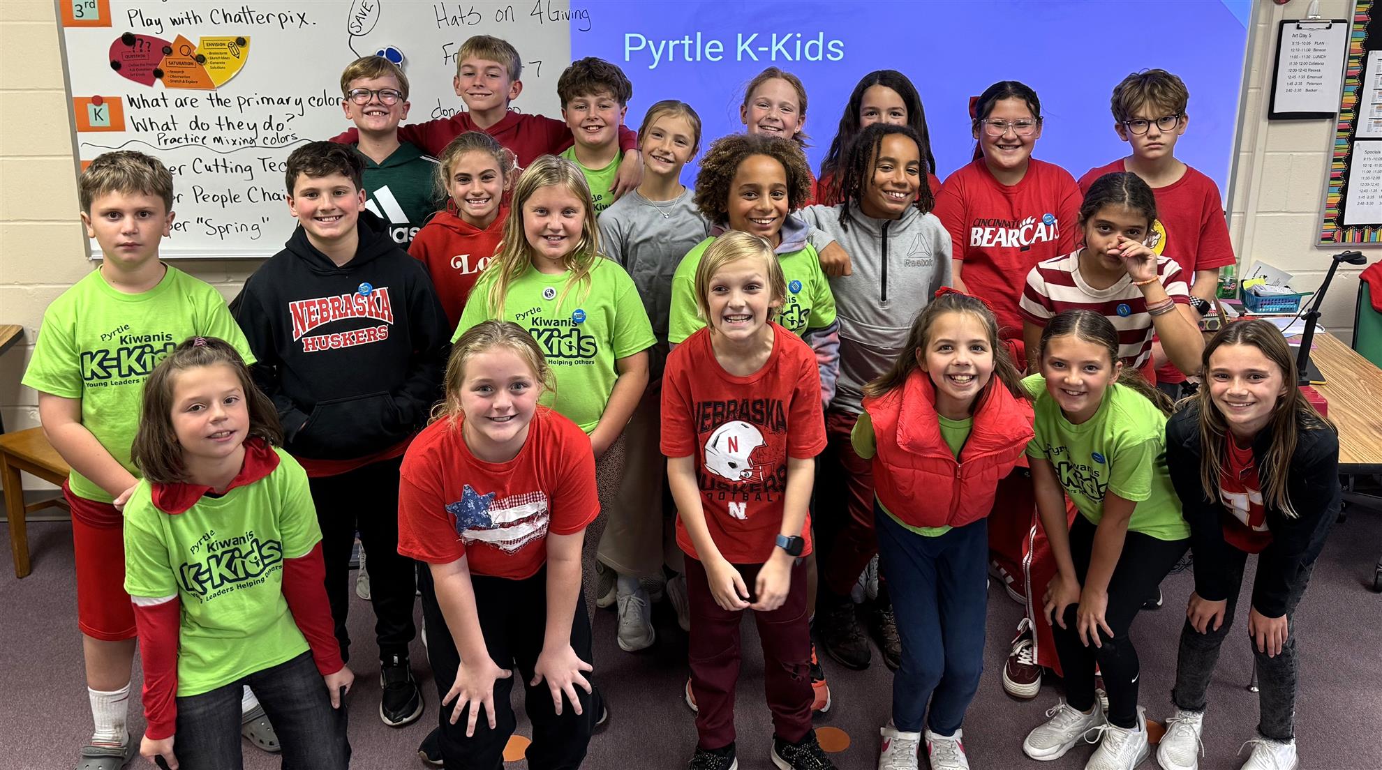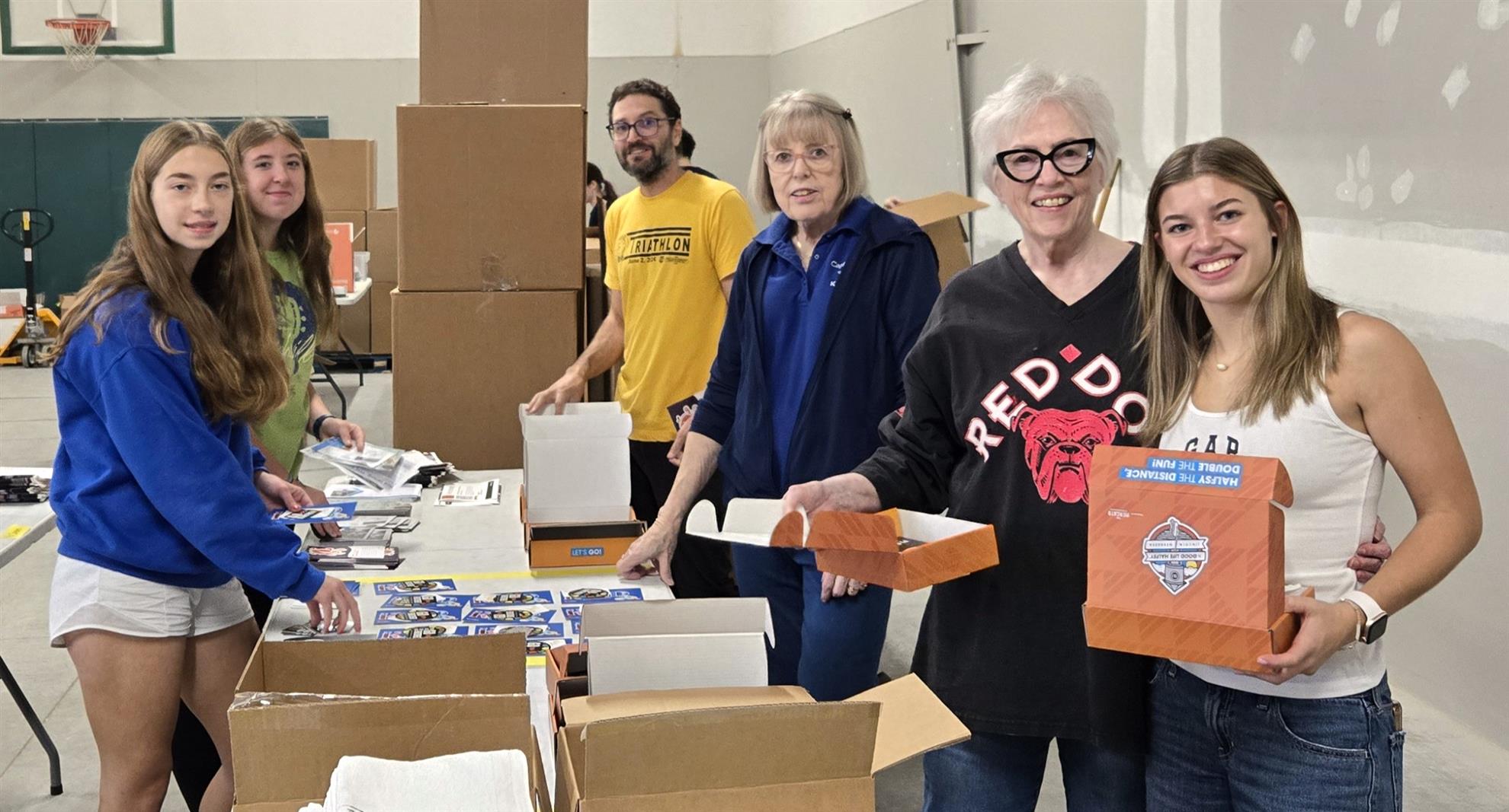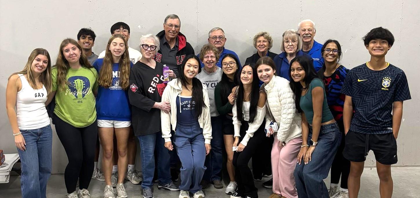 On November 4, 2025 seven Capital City Kiwanis members assisted twenty-four Lincoln East Key Club members stuff packets for Pink Gorilla’s Good Life Halfsy Race held the following weekend. Members from both clubs worked together for over two hours in small groups to stuff packets of t-shirts, snacks, brochures, & coupons. Some members were also called upon to unwrap race award medals. For their efforts, Lincoln East Key Club will be paid $1,350 which they plan to use to purchase fleece for their second semester blanket project.